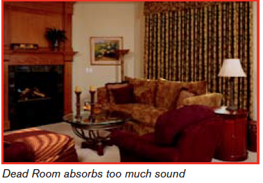 The other extreme is an overly damped, “dead” space: thick-pile carpeting, heavy floor-to-ceiling draperies, and dense, over-stuffed furniture. A room like this sounds like you’re trapped in a small coat closet packed with winter coats. Totally muffled and closed in. (See figure 2.)
