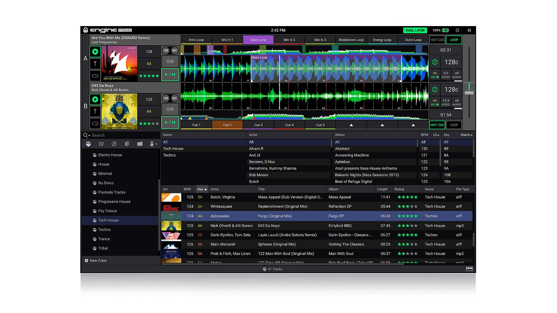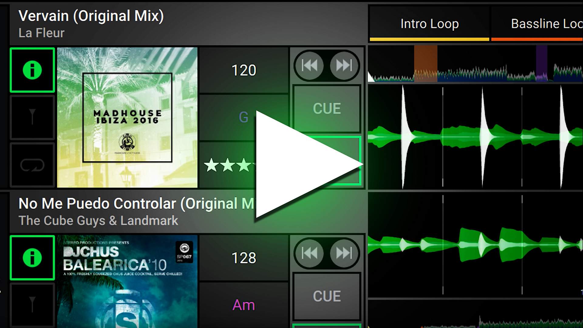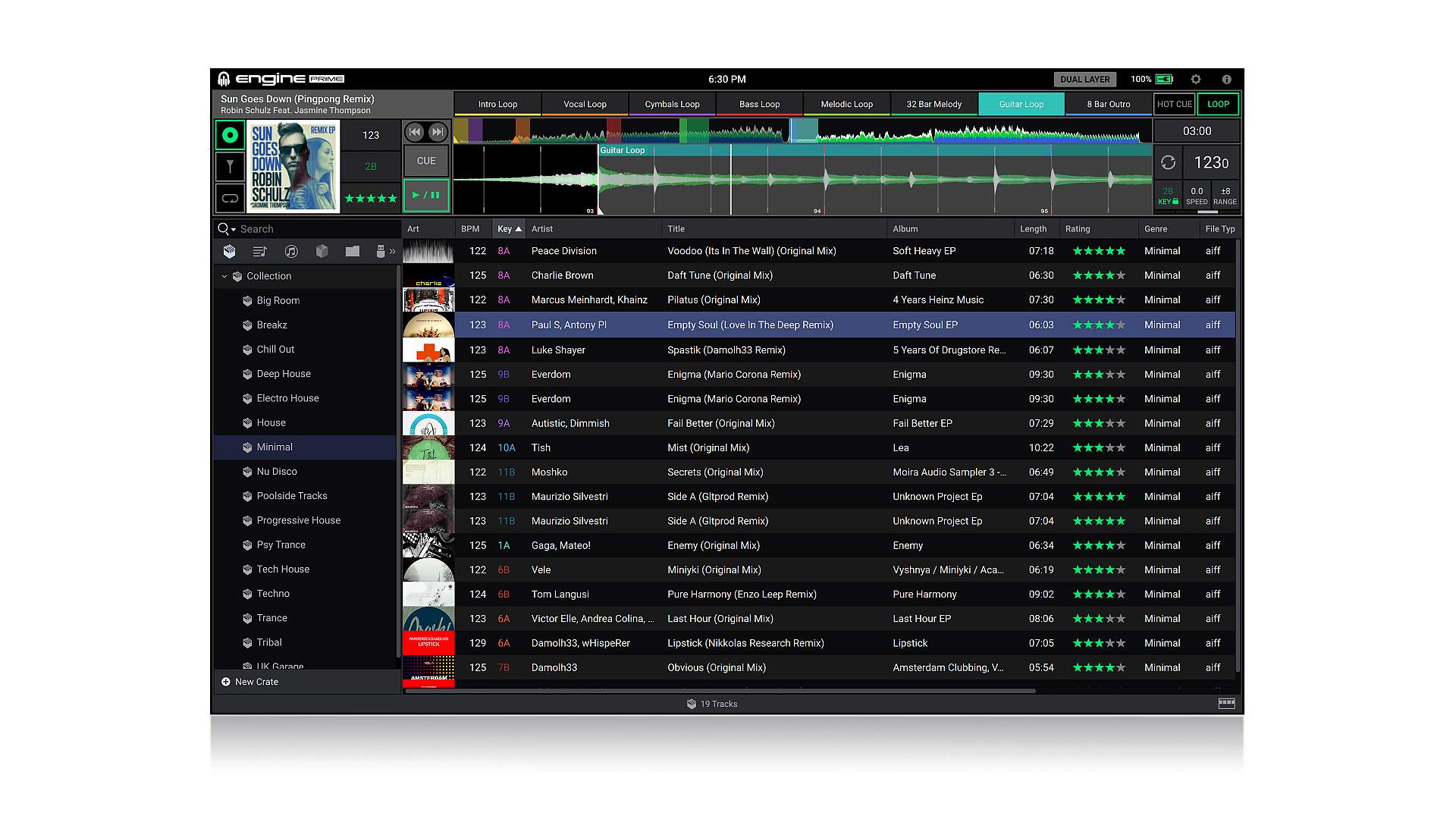 Importuj i analizujGdy Twoje utwory są importowane, Engine Prime wykonuje niezwykle dokładne umieszczenie beatgrid, obliczając muzyczny klucz harmonijny utworu (wyświetlany w stylu Camelot lub tradycyjnym), a także podaje grafikę dla utworów, BPM i wszystkie inne metadane. Trójkolorowym przebiegom o wysokiej rozdzielczości towarzyszy pełny opis ścieżki, pomagając w łatwiejszym dodawaniu skwantowanych HOT-CUES, LOOP (ręcznych i automatycznych) wzdłuż osi czasu.