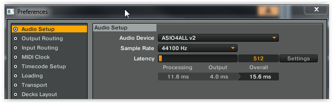 - In Traktor, choose File > Preferences to open the preferences window, and then choose Audio Setup from the left column. In the right column next to Audio Device, choose ASIO4ALL v2.