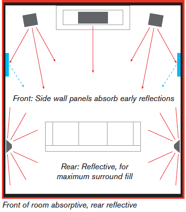 Conversely, try to keep the rear of the home theater room relatively reflective, since you want the sound from the surround speakers to reflect around the rear of the room as much as possible to fill that area with ambient sound.