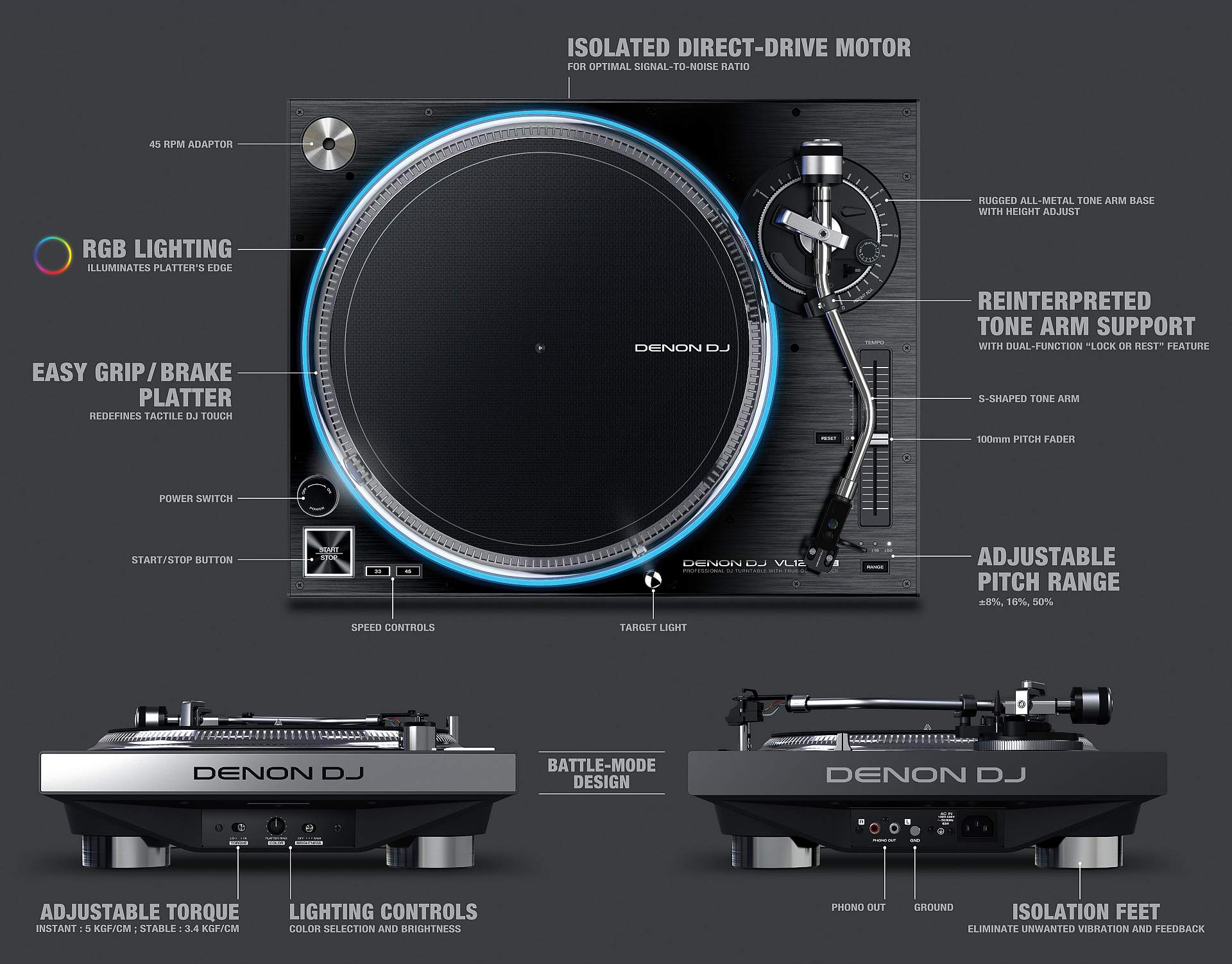 VL12 Prime został zaprojektowany i stworzony od podstaw przez firmę Denon DJ, aby mógł stać się idealnym gramofonem dla profesjonalistów. Ciężka metalowa konstrukcja „Duty all”, regulowany moment obrotowy zapewnia swobodne dopasowanie do indywidualnego stylu danego DJ-a, VL12 pozwala na cięcia, scratch oraz miks łącząc dowolną muzykę w sposób wręcz idealny.